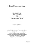 República Argentina INFORME DE COYUNTURA Enero de 2015 Ministerio de Agricultura, Ganadería y Pesca Secretaría de Agricultura, Ganadería y Pesca Subsecretaría de Pesca y Acuicultura Dirección Nacional de Planificación Pesquera Coordinación de Gestión de Pesquerías Dirección de Economía Pesquera Página 1 de 26 DESEMBARQUES Desembarques totales por principales especies. Desembarques acumulados al 31/01 de cada año Enero de 2015 Especie Abadejo (Genypterus blacodes) Variación anual t. 230,9 81,9% 1,5 -87,2% 507,1 238,7 386,1 61,7% -41,4% 94,1 40,8 23,9 -41,4% 130,9 -0,1% 1.614,7 131,1 130,9 -0,1% Cazón (Galeorhinus galeus) 2,1 -6,8% 0,2 2,3 2,1 -6,8% Centolla (Lithodes santolla) 223,0 -59,8% 562,8 555,2 223,0 -59,8% Corvina blanca (Micropogonias furnieri) 524,5 -63,4% 2.010,6 1.432,1 524,5 -63,4% Gatuzo (Mustelus schmitti) 206,0 35,9% 370,0 151,6 206,0 35,9% 8.876,3 7,9% 3.489,9 8.230,0 8.876,3 7,9% Caballa (Scomber japonicus) Calamar Illex (Illex argentinus) -87,2% 386,1 61,7% 23,9 359,6 2015 11,3 Besugo (Sparus pagrus) 81,9% 1,5 2014 126,9 Anchoíta (Engraulis anchoita) 230,9 2013 Variación porcentual 2015 respecto 2014 Langostino (Pleoticus muelleri) Lenguados nep (Paralichthys patagonicus) Merluza de cola (Macruronus magellanicus) Merluza hubbsi (Merluccius hubbsi) Merluza negra (Dissostichus eleginoides) 693,0 31,6% 593,6 526,6 693,0 31,6% 1.204,6 143,6% 3.584,9 494,5 1.204,6 143,6% 5.800,1 -32,1% 9.638,7 8.544,0 5.800,1 -32,1% 712,0 - 38,1 712,0 - Mero (Acanthistius brasiliensis) 165,2 17,2% 217,9 140,9 165,2 17,2% Pescadilla (Cynoscion guatucupa) 1.008,9 115,0% 860,6 469,2 1.008,9 115,0% Polaca (Micromesistius australis) 772,0 - 443,6 772,0 - 1.573,8 100,9% 1.106,8 783,3 1.573,8 100,9% Rayas (Rajiformes) Vieira, callos (Zygochlamys patagónica) Sutotal 6,5 -98,3% 281,2 380,0 6,5 -98,3% 22.541,2 1,3% 25.774,6 22.258,4 22.541,2 1,3% Total 24.865,5 3,6% 28.404,0 24.004,0 24.865,5 3,6% Fuente: Coordinación de Gestión de Pesquerias sobre la base de información de la DNCP. Datos actualizados al 31 de enero de 2015. Página 2 de 26 CAPTURAS Capturas por Flotas Capturas por Puertos Fuente: Coordinación de Gestión de Pesquerias sobre la base de información de la DNCP. Datos actualizados al 31 de Enero de 2015. Página 3 de 26 CAPTURAS Capturas totales de la flota argentina en la Zona Común de Pesca Argentino-Uruguaya por especies. Especie Abadejo Anchoa de banco Bacalao austral Bagre Besugo Bonito Brótola Calamar Illex Calamar Loligo Castañeta Chernia Congrio Corvina blanca Gatuzo Jurel Lenguados nep Lisa Merluza hubbsi Mero Notothenia Palometa Pargo Pescadilla Pescadilla real Pez ángel Pez gallo Pez limón Pez palo Pez sable Raya cola corta Raya de círculos Raya hocicuda / picuda Raya lisa Raya marmolada Raya pintada Rayas nep Róbalo Rubio Salmón de mar Variación porcentual sobre mismo período en 2014 Acumulado enero 2015 t. 12,6 - 5,3 - 1,1 - 3,2 14,4% 356,7 72,1% 12,3 20,0% 6,2 62,4% 6,9 -5,2% 1,1 -72,8% 4,6 50,3% 1,4 74,4% - - 441,1 -66,4% 132,7 24,3% 1,2 9,0% 574,0 43,3% 3,0 -81,6% 48,9 - 40,0 65,6% 0,5 -65,9% 9,4 -80,6% 148,5 -20,8% 660,1 71,5% 17,8 -54,0% 333,1 35,5% 0,6 54,9% 0,5 20,0% 854,7 55,7% 9,4 -42,1% - - 12,9 - 57,1 - - - 8,7 - - - 724,5 40,6% - - 14,7 - 35,4 162,1% Página 4 de 26 Especie Salmonete Sargo Savorín Tiburón espinoso Tiburones nep Otros peces Variación porcentual sobre mismo período en 2014 Acumulado enero 2015 t. 4,5 - 2,4 - - - 9,0 267,2% 11,0 - 0,2 -51,2% Total general 4.567,4 10,5% Fuente: elaboración propia sobre la base de información de la DNCP. Datos actualizados al 31 de Enero de 2015. Las capturas en la ZCPAU correspondientes a la flota uruguaya pueden consultarse en el sitio web de la Comisión Técnica Mixta del Frente Marítimo: http://www.ctmfm.org/estadisticas/estad_capt.asp Página 5 de 26 Desembarques de Langostino por buque 2014 Buque 10 DE NOVIEMBRE 122-B 17 DE OCTUBRE 3 DE ABRIL 7 DE AGOSTO AGUSTINA.. ALCO BARI ALFEREZ ALTALENA ALTAR ALVAREZ ENTRENA I ALVAREZ ENTRENA II ALVAREZ ENTRENA III ALVAREZ ENTRENA IV ALVER ANA III ANAVE ANITA ALVAREZ ANTONELLA ANTONIO ALVAREZ API V API VI ARAUCANIA ARBUMASA I ARBUMASA X ARBUMASA XIV ARBUMASA XIX ARBUMASA XV ARBUMASA XVI ARBUMASA XVII ARBUMASA XVIII ARESIT ARGENOVA I ARGENOVA II ARGENOVA III ARGENOVA IV ARGENOVA IX ARGENOVA VI ARGENOVA X ARGENOVA XXII ARGENOVA XXIII ARGENOVA XXIV ARGENOVA XXV ARGENOVA XXVI ARGENTINO ARVI ATREVIDO BAFFETTA BAHIA DESVELOS BELEB BELVEDERE BORRASCA Desembarques de langostino 2014 (t) 2,1 0,1 57,2 23,7 38,4 40,6 497,8 26,3 5,9 861,2 1.371,5 1.485,6 1.047,1 990,8 965,6 242,0 281,1 544,4 703,6 1.642,0 21,8 922,8 888,9 995,8 976,1 1.025,7 1.256,4 1.052,3 964,0 1.312,3 1.309,8 1.027,4 1.185,2 1.211,5 822,4 943,2 1.298,8 871,9 932,2 1.274,9 1.512,4 1.175,0 1.163,8 732,9 12,0 62,2 7,6 225,2 1.092,7 26,6 0,6 1.207,0 Página 6 de 26 Buque BUENA PESCA CABO DE HORNOS CALABRIA CALETA PAULA CALIZ CAMERIGE CAMILA N CAPITAN GIACHINO CARMEN A CENTAURO 2000 CIUDAD DE HUELVA CIUDAD FELIZ CLAUDIO COALSA SEGUNDO CODEPECA III CODEPECA IV COMANDANTE LUIS PIEDRABUENA CONARA I CONARPESA I CONTE VIANCAMANO CRISTINA ANTONIA CRISTO REDENTOR DESEADO DIEGO FACUNDO DIEGO FERNANDO DON BOCHA DON CARLOS I DON GAETANO DON GIULIANO DON JOSE DI BONA DON JUAN (02815) DON JUAN. DON NATALIO DON NICOLA DON OSCAR DON PABLO DON PACO DON PEDRO. DON RAIMUNDO DON RAUL DON SANTIAGO DON TOMASSO DON VICENTE II DON VICENTE VUOSO DOÐA ALFIA DOÐA RUTH EL GAUCHITO EL MALO I EL NENE EL PROFETA. EL SANTO EL TEHUELCHE ELSA LIBERTAD EMPESUR I EMPESUR II Desembarques de langostino 2014 (t) 1.212,3 28,3 1.146,1 721,8 1.137,4 0,2 34,4 809,7 507,8 1.022,1 885,8 14,7 30,6 16,5 318,5 876,0 7,3 882,8 2.110,1 2,5 0,0 488,5 506,5 15,2 1.239,4 153,5 0,0 3,5 1.007,2 1.636,0 22,2 62,9 495,2 2,8 769,3 268,6 39,7 19,8 0,8 111,4 17,7 713,5 10,8 1.069,1 628,0 58,0 383,7 796,8 22,4 47,8 645,0 1.275,6 128,8 675,6 937,4 Página 7 de 26 Buque EMPESUR III EMPESUR IV EMPESUR V ENRIQUE F ENTRENA DOS ENTRENA UNO E