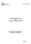 MINISTERIO DE EDUCACIÓN, CULTURA Y DEPORTE CONSEJO SUPERIOR DE DEPORTES PROGRAMA NACIONAL DE TECNIFICACIÓN DEPORTIVA VALORACIÓN ANTROPOMÉTRICA: PROTOCOLO DE MEDICIÓN MARTÍN FIERRO S/N 28040 MADRID TEL: 915 896 700 FAX: 915 896 614 1) INTRODUCCIÓN La Técnica Antropométrica es sencilla y no requiere de un material costoso. La fiabilidad dependerá de la habilidad del antropometrista y de su rigor en la toma de las medidas. El Protocolo ha de ser estandarizado para que puedan ser comparables los resultados. Se han seleccionado 11 variables antropométricas que constituyen el nivel básico o mínimo a cumplir por todas las federaciones. El resto de medidas que formarán parte de la exploración antropométrica dependerá fundamentalmente del objetivo de dicho estudio y tendrá en cuenta el deporte al que pertenece el sujeto estudiado para poder incluir medidas corporales específicas. 2) CONDICIONES GENERALES a) La exploración se realizará en una estancia suficientemente amplia y a una temperatura confortable. El sujeto estudiado estará descalzo y con la mínima ropa posible, como pantalón corto o bañador. b) Las medidas de peso corporal y estatura sufren variaciones a lo largo del día, por lo que es deseable realizarlas a primera hora de la mañana. Y si esto no es posible, conviene indicar la hora del día y las condiciones del momento, como ingesta de alimentos o entrenamiento previo. c) El material será calibrado y comprobada su exactitud antes de iniciar la toma de las medidas. d) La exploración se iniciará marcando los puntos anatómicos y las referencias antropométricas necesarias para el estudio. Las medidas se tomarán siguiendo un orden práctico y cómodo para el estudiado. 3) MATERIAL ANTROPOMÉTRICO PARA EL NIVEL BÁSICO a) Báscula: para la obtención del peso corporal. Precisión de 100 gr. b) Tallímetro o Estadiómetro: para medir la estatura y la talla sentado. Precisión de 1 mm. c) Compás de pliegues cutáneos: Para medir el espesor del tejido adiposo subcutáneo. Precisión de 0.2 MM. d) Cinta antropométrica: sirve para la medición de los perímetros y también para localizar el punto medio entre dos referencias anatómicas. Precisión de 1 mm. MINISTERIO DE EDUCACIÓN, CULTURA Y DEPORTE 2 COSEJO SUPERIOR DE DEPORTES e) Lápiz dermográfico: para la señalización de los puntos anatómicos y referencias antropométricas. f) Material auxiliar: Tablón milimetrado; banqueta. 4) VARIABLES ANTROPOMÉTRICAS DEL NIVEL BÁSICO a) b) c) d) e) f) Peso corporal. Talla o Estatura. Talla Sentado. Envergadura. 5 pliegues cutáneos (bíceps, tríceps, subescapular, cresta ilíaca y pierna medial). 2 perímetros (brazo relajado y pierna máxima). 5) PROTOCOLO DE MEDIDAS ANTROPOMETRICAS a) Peso Corporal Definición: En sentido estricto, debería usarse el término de masa corporal en lugar de peso corporal Instrumental: Báscula o balanza pesa personas. La medida del peso corporal se expresa en kilos (kg.), con una precisión de 0. 1 kg. Técnica: El sujeto se sitúa de pie en el centro de la plataforma de la báscula distribuyendo el peso por igual en ambas piernas, sin que el cuerpo este en contacto con nada que haya alrededor y con los brazos colgando libremente a ambos lados del cuerpo. La medida se realiza con la persona en ropa interior, bailador o pantalón corto de tejido ligero, sin zapatos ni adornos personales. b) Estatura Definición: La estatura se define como la distancia que existe entre el vértex y el plano de sustentación. También se le denomina como talla en bipedestación o talla de pie, o simplemente como talla. Instrumental: Estadiómetro. La medida de la estatura se expresa en centímetros (cm), con una precisión de 1 mm. Técnica: El sujeto se coloca de pie, completamente estirado, con los talones juntos y apoyados en el tope posterior y de forma que el borde interno de los pies formen un ángulo de aproximadamente 60 grados. Las nalgas y la parte alta de la espalda contactan con la tabla vertical del estadiómetro. El antropometrista coloca la cabeza MINISTERIO DE EDUCACIÓN, CULTURA Y DEPORTE 3 COSEJO SUPERIOR DE DEPORTES del estudiado en el plano de Frankfort y realiza una tracción de la cabeza a nivel de los procesos mastoides, para facilitar la extensión completa de la columna vertebral. Se indica al sujeto que realice una inspiración profunda sin levantar la planta de los pies y manteniendo la posición de la cabeza. Se desciende lentamente la plataforma horizontal del estadiómetro hasta contactar con la cabeza del estudiado, ejerciendo una suave presión para minimizar el efecto del pelo. En esta medida el sujeto deberá estar descalzo. c) Talla Sentada Definición: La talla sentada se define como la distancia entre el vértex y la superficie donde se encuentra sentado el sujeto Instrumental: El material empleado para su medición es un estadiómetro especial diseñado para este fin, llamado " mesa de medida para posición sentada ". También puede emplearse un banco con una altura conocida que pueda adaptarse al estadiómetro o bien puede utilizarse una mesa y un antropómetro. La medida de la talla sentada se expresa en centímetros (cm), con una precisión de 1 mm. Técnica: El sujeto se coloca sentado, erecto en la mesa de medida, apoyando toda la superficie de los muslos sobre esta, de forma que las rodillas queden justo al borde de la mesa y en flexión de 90 grados. En esta posición debe existir un ángulo recto entre el tronco y los muslos y también un ángulo recto entre los muslos y las piernas. Los brazos deben estar colgando a ambos lados del cuerpo, situando las palmas de las manos sobre los muslos. El procedimiento a seguir es el mismo que para la estatura. d) Envergadura Definición: La envergadura es la distancia existente entre los puntos dedales de la mano derecha y de la mano izquierda cuando la extremidad superior esta en máxima extensión y colocada a la altura de los hombros. Instrumental: El material e