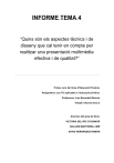 INFORME TEMA 4 “Quins són els aspectes tècnics i de disseny que cal tenir en compte per realitzar una presentació multimèdia efectiva i de qualitat?” Primer curs del Grau d’Educació Primària, Assignatura: Les TIC aplicades a l’educació primària. Professora: Lina Escandell Bonnín Treball: informe tema 4 Alumnes del grup de feina: VICTORIA DEL RÍO O’CONNOR GUILLEM MARTORELL MIR DAVID HERNÁNDEZ RAMÓN INTRODUCCIÓ La pràctica educativa actual no s’entén sense tenir en compte l’aplicació de les TIC en molts de moments i contextos en els quals aquesta es du a terme. Per aquest motiu, es fa molt necessària la bona praxis per part dels docents a l’hora d’usar aquestes tecnologies. Una de les tecnologies més usades, ja sigui per la seva facilitat d’ús o per la seva implantació progressiva en la majoria de centres, té a veure amb la tecnologia projectiva, tant d’imatges en moviment com d’imatges estàtiques. És en aquest àmbit concret en el qual trobam les presentacions multimèdia, que fan ús de les capacitats visuals i sonores de les tecnologies digitals actuals. En aquest informe de feina ens fixarem en els aspectes organitzatius, tècnics i estètics que haurien de complir les presentacions multimèdia per complir de manera satisfactòria la seva funció comunicativa. En primer lloc parlarem tant d’aspectes tècnics i d’organització que s’han de tenir en compte a l’hora de planificar una presentació multimèdia. En segon lloc ens fixarem en els aspectes de disseny que fan referència a la correcta utilització tant a les imatges, com la tipografia, el color, l’ús de gràfics i tables i en quina és la millor manera de conjuntar tots aquests elements. Per acabar parlarem dels possibles condicionants tant tècnics com ambientals a prendre en consideració a l’hora de projectar o de compartir les nostres presentacions audiovisuals. MARC TEÒRIC ­CONSIDERACIONS PRÈVIES El primer que s’ha de tenir en compte a l’hora d’enllestir una presentació multimèdia segons Pixelworking(2015) és que la presentació no ha de substituir l’exposició, sinó què és una eina de recolzament. Per aquest fet, hi ha una sèrie d’aspectes a tenir en compte a l’hora de començar­la. En primer lloc s’ha d’identificar l’audiència i s’ha de definir un objectiu. No és el mateix fer una presentació per un grup de primària que fer­la per a la part de defensa d’una unitat didàctica en d’un procés de concurs d’oposició. Per tant, s’ha de preveure que el contingut i la forma de la presentació han de variar segons quina sigui l’audiència a qui va dirigida. En segon lloc, i no per això menys important, s’ha de definir una estructura de la presentació, fet que ajudarà a que la presentació tengui continuïtat, sense bots que confonguin a l’audiència i encara pitjor a un mateix. Es molt recomanable fer­se un diagrama o un storyboard que servesqui com a columna vertebral de l’exposició. ­ASPECTES DE DISSENY: LA IMATGE Les imatges són eines de gran ajuda quan són utilitzades correctament. Però si no són correctament usades poden convertir­se en una gran distracció. L’ús d’elements visuals solen ser recomanables per cridar l’atenció del públic, però només si aquestes són rellevants i necessàries. Sobretot de cara a l’entrada de la presentació, per engrescar l’audiència des del principi. Cal destacar que més del 80% de la informació del món que ens arriba pels nostres sentits són imatges. És degut a aquesta saturació d’imatges que el nostre cervell s’en recorda de les més impactants, per això a l’hora de fer una presentació hem d’utilitzar imatges originals, i que siguin fàcils de recordar. i no emprar per les presentacions imatges comunes i monòtones. En quan als tipus d’imatges podem classificar­les en; de creació pròpia, que són les fetes per un mateix sense cap tipus de problemes de drets d’autor, en segon lloc tenim les de pagament,que solen ser imatges d’alta qualitat i d’aspecte professional, aquestes solen tenir drets d’autor (¡Stock és un exemple), i en darrer lloc tenim la opció més utilitzada que es el banc d’imatges, per descarregar imatges gratuïtes ( com per exemple Google imatges). EL VÍDEO Primer de tot, els vídeos que afegirem a la presentació han de ser breus, quant més breus millor, d’aquesta manera evitarem avorrir als oients i fer una presentació més ràpida i dinàmica. Així doncs, els vídeos haurien de tenir una durada mitjana d’entre 1 i 2 minuts, i, quant més explicatius i clars siguin, millor. Per evitar silencis incòmodes a l’hora de fer una presentació cal precarregar els vídeos abans de començar la nostra intervenció. LES TRANCISIONS L’ús de les transicions pot ser tant el nostre millor aliat com el pitjor malson a l’hora de fer una presentació. Per una part, si s’aprofita aquesta eina i se li dóna un ús funcional, es pot convertir una presentació estàtica en una presentació més dinàmica. Ara bé, el problema resideix en la quantitat i el tipus de transició, ja que si en tota la presentació s’afegeixen de manera massiva girs i més girs els espectadors poden acabar avorrits i poden perdre l’interès, com diu Velásquez: “ les transicions en excés distreuen , fan més lenta la presentació i fins i tot poden aconseguir que es bloquegi la presentació al reproduir­se en equips amb poca memòria.” (2008) Es a dir, les transicions han de ser dinàmiques i han de ser adequades en nombre, per no marejar als oients. EL COLOR A les Presentacions multimèdia el color és un element important tant per el que es refereix a aspectes estètics, com per les seves connotacions psicològiques i semàntiques. A l’hora d’usar­lo en les presentacions s’han de considerar aspectes referents al contrast, a les gammes cromàtiques, i a la seva simbologia. Segons Cáceres i Codina (2005), tècnic