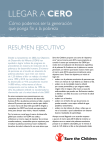 llegar a ceRO Cómo podemos ser la generación que ponga fin a la pobreza Resumen ejecutivo Desde su lanzamiento en 2002, los Objetivos de Desarrollo del Milenio (ODM) han ayudado a lograr índices de progreso sin precedentes en materia de reducción de la pobreza y de desarrollo humano. El número de personas en el mundo en situación de pobreza absoluta –que viven con menos de 1,25 dólares al día– se redujo a la mitad entre 1990 y 2010. La mortalidad infantil ha disminuido un 41%: actualmente mueren 14.000 niños y niñas menos al día en comparación con los índices de 1990. La cifra de población infantil no escolarizada ha disminuido casi a la mitad desde el año 2000.1 En estos momentos nos encontramos en una coyuntura decisiva en la historia del desarrollo humano. El fin a la pobreza extrema se halla a nuestro alcance. El proceso que está en marcha para definir un nuevo marco de desarrollo post-2015 dirigido a reemplazar los ODM nos brinda una oportunidad única para abrazar esta visión y hacerla realidad. Por lo tanto, es crucial que el marco de desarrollo global que suceda a los ODM sea audaz y ambicioso: un marco capaz de impulsar las acciones transformadoras y sostenibles que se requieren para erradicar la pobreza extrema y hacer realidad los derechos de toda la infancia. Es con este ánimo que Save the Children propone una serie de “objetivos cero” para el marco post-2015, cuyo propósito es concluir la tarea que comenzaron los ODM por medio de la erradicación de dimensiones específicas de la pobreza. En Acabemos con la pobreza en nuestra generación, un informe que ilustra nuestra visión para el marco post-2015, expusimos inicialmente estos objetivos cero.2 Entre los objetivos, se incluía el logro de: • acabar con la pobreza económica de personas que viven con menos de 1,25 dólares y 2 dólares al día. • acabar con la mortalidad materno infantil por causas prevenibles, y que ninguna madre, ningún niño ni ninguna niña muera a causa de enfermedades que pueden ser fácilmente tratadas o debido a una falta de acceso a servicios de salud de calidad. • acabar con el hambre. • acabar con el hecho de que las personas no puedan acceder a una mejor calidad de agua potable y saneamiento. • acabar con los índices de niños y niñas que no van a la escuela o que la abandonan sin obtener buenos resultados de aprendizaje. Aunque se está llegando a un acuerdo respecto a que en el marco post-2015 debería incluirse un objetivo cero en materia de pobreza económica porque es un objetivo alcanzable, por lo menos al nivel de 1,25 dólares al día, se han planteado dudas llegar a cero con relación a si son alcanzables los objetivos cero (o, en otras palabras, el 100% del logro de los objetivos) de acabar con otras dimensiones críticas de la pobreza. Como contribución a este importante debate, el presente informe expone el argumento de que, siempre que se den ciertas condiciones, la mayoría de estos objetivos cero sí pueden alcanzarse para el año 2030. Para lograrlo, los Gobiernos deben abordar la desigualdad económica y mejorar la gobernanza con firmeza. Además, deberán hacerse esfuerzos conjuntos para fomentar programas clave de reducción de pobreza con el fin de llegar a los grupos en mayor situación de pobreza y marginación, particularmente en África Subsahariana y en Estados frágiles y afectados por conflictos. El propósito de la investigación expuesta en ese informe era proyectar los índices futuros de cambio en diversas dimensiones de la pobreza para determinar si los objetivos cero podrían alcanzarse de forma realista siguiendo las trayectorias de siempre. Si esto no era posible, nos propusimos analizar si las mejoras a escala macro en la distribución del ingreso y en la calidad de la gobernanza podría ayudar a sentar las bases para llegar al objetivo cero. Para conseguirlo, proyectamos, hasta el año 2030, las actuales tendencias globales en índices de cambio en mortalidad infantil, acceso a agua y saneamiento, y logros en materia de educación en tres marcos hipotéticos distintos de desigualdad y gobernanza: “continuar como siempre”, “abordar la desigualdad económica” y “abordar tanto la desigualdad económica como la calidad de la gobernanza”. Descubrimos que si se mantiene la tendencia actual en materia de desigualdad económica y no mejora la calidad de la gobernanza, es muy poco probable que para el año 2030 logremos los objetivos cero, incluso aunque se produzca un marcado crecimiento económico. Sin embargo, esta situación cambia radicalmente si reducimos la desigualdad económica al nivel más bajo que cada país ha tenido durante los últimos 30 años y si, además, mejoramos la gobernanza. En este marco hipotético vemos que los índices de pobreza se reducen a un nivel de entre 1 y 6 puntos porcentuales de cero en todas nuestras áreas prioritarias. Concluimos que para el año 2030 podríamos: • reducir los índices globales de mortalidad infantil a 20 muertes por cada 1.000 nacidos vivos (nuestro nivel máximo propuesto para muertes que pueden considerarse prevenibles), salvando 1,8 millones de vidas infantiles al año.3 2 • garantizar que el 99% de la población mundial tenga acceso a agua de mejor calidad: el equivalente a casi 280 millones adicionales de personas que con las condiciones del marco hipotético “continuar como siempre”. • aumentar hasta un 94% la cobertura de instalaciones de saneamiento mejoradas, llegando a 920 millones adicionales de personas que en nuestro marco hipotético “continuar como siempre”. • asegurar que el 98% de los niños y las niñas que comienzan la enseñanza primaria lleguen hasta el último grado. Así, si los Gobiernos realizan los cambios en el ámbito de la desigualdad económica y la gobernanza que se requieren en base a nuestras hipótesis de proyecciones, estaremos a un paso de ganar la batalla para llegar a cero. Sin embargo, según nuestro an