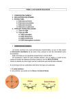 TEMA 6. LOS ÁCIDOS NUCLEICOS 1. COMPOSICIÓN QUÍMICA 2. NUCLEOTIDOS DE INTERÉS 3. ESTRUCTURA a. Estructura primaria b. Estructura secundaria c. Estructura terciaria d. Estructura cuaternaria 4. TIPOS DE ÁCIDOS NUCLEICOS a. Tipos de ADN b. Tipos de ARN b.1 ARN mensajero b.2 ARN ribosómico b.3 ARN transferente b.4 ARN heterogéneo nucleolar 1. COMPOSICION QUIMICA. Los ácidos nucleicos son unas biomoléculas fundamentales, ya que en ellas reside la información hereditaria de los seres vivos, aunque no son tan abundantes como las proteínas. Están formadas por los siguientes bioelementos: C, O, H, N, P. Se constituyen a partir de unas unidades básicas, que se repiten y a partir de las cuales se forman las cadenas de ácidos nucleicos, son los NUCLEOTIDOS. Vamos a estudiar en primer lugar cual es la estructura química de estas unidades. En la formación de los nucleótidos intervienen tres tipos de sustancias: 1. El acido fosfórico 2. Una pentosa, que puede ser la ribosa o la desoxirribosa, 3. Bases nitrogenadas, que pueden ser de dos tipos: · Bases púricas: Adenina, Guanina. · Bases pirimidinicas: Citosina, Timina, Uracilo. Las bases púricas derivan del anillo de purina y las pirimidinicas del anillo de pirimidina. NUCLEÓSIDO Es la unión de una pentosa con una base nitrogenada mediante enlace N-glucosídico. En el enlace se unen los siguientes elementos: - en el caso de que sea una base púrica entre el C1´de la pentosa y el N9 de la base nitrogenada; - cuando es una base pirimidinica entre el C1´de la pentosa y el N1 de la base nitrogenada, formándose un NUCLEOSIDO. Estos se nombran añadiendo al nombre de la base el sufijo – osina, cuando es una base purica y el sufijo –idina, cuando es una base pirimidinica, por ejemplo: adenosina, timidina. NUCLEÓTIDO Es la unión de un nucleósido con una molécula de ácido fosfórico mediante enlace éster-fosfórico. Los nucleótidos se nombran añadiendo al nombre del nucleósido, fosfórico, por ejemplo: adenosín fosfato, timidín fosfato; Los nucleótidos tienen un fuerte carácter ácido, debido a su unión con el ácido fosfórico, que cuando se encuentra en disolución esta ionizado, con carga negativa. 2. NUCLEÓTIDOS DE INTERÉS. Los nucleótidos son moléculas que tienen una gran importancia biológica, ya que además de formar parte de los ácidos nucleicos, llevan a cabo algunas funciones fundamentales en los seres vivos. a. Moléculas acumuladoras de energía Existen moléculas capaces de acumular energía en ciertos enlaces de manera que pueda ser utilizada con posterioridad en el momento preciso. Estas moléculas son fundamentalmente el ATP (adenosintrifosfato) y en menor medida el GTP (guanosin trifosfato). Cuando existe energía disponible una molécula de ADP la emplea en formar un enlace de alta energia (~) con un tercer grupo fosfato para formar ATP. Este enlace es altamente energético, lo que quiere decir que para su formación se requiere una cantidad considerable de energía (7 kcal/mol) y su rotura libera también esta energía en su momento. Por ello, el sistema ADP/ATP constituye una forma de “almacenar” la energía liberada en reacciones biológicas b. Moléculas con función coenzimática Existen ciertos dinucleótidos, que unidos a vitaminas, son necesarios para que funcionen las enzimas del metabolismo celular. Ejemplos: Nicotinamin adenin dinucleótido (NAD + ) : es un derivado de la vitamina B3 o nicotinamida. Actúan metabolismo oxidativo de glucidos y proteinas. Nicotinamin adenin dinucleotido fosfato (NADP+): es igual que el anterior pero fosforilado. En reacciones químicas en plantas. Flavin adenin dinucleotido: es un derivado de la riboflavina o vitamina B2. Participan en la respiración celular c. Adenosin monofosfato ciclico (AMPc) Esta molécula actúa como intermediario entre moléculas que llegan a la célula desde otros lugares (hormonas, neurotransmisores) y procesos que deben desencadenarse en su interior, por ello se le denomina segundo mensajero y es de gran importancia en la respuesta celular. Actividad1: Escribe un nucleótido que forma parte del ADN y otro del ARN .¿Qué diferencias hay entre ellos? Actividad2: .¿Que es un enlace fosfodiéster? Pon un ejemplo. Actividad3: ¿Tiene alguna semejanza el enlace nucleotídico con otros enlaces existentes en algunas moléculas? Pon un ejemplo Actividad4: ¿Sabrías explicar por qué suele denominarse al ATP “moneda energética”? Actividad5: ¿Por qué los ácidos nucleicos tienen carácter ácido? 3. ESTRUCTURA a) ESTRUCTURA PRIMARIA La estructura primaria se corresponde con la unión de nucleótidos entre si, para formar una larga cadena de polinucleótidos. La unión se establece entre el –OH que ocupa el C3 de un nucleótido con el – OH del ácido fosfórico del nucleótido siguiente que se encuentra en la posición 5´, mediante un enlace éster fosfórico, liberándose una molécula de agua, llamado enlace nucleotídico. En la estructura primaria, como sucedía en las proteínas, es muy importante el orden en el que se unen los nucleótidos a lo largo de la cadena, es decir, la SECUENCIA DE NUCLEOTIDOS. Si observara una cadena de ADN, por ejemplo, nos daríamos cuenta que el esqueleto de la cadena es siempre igual, es decir, una sucesión de pentosa y acido fosfórico continuamente, y que lo único que varia a lo largo de la cadena son las bases nitrogenadas, es por ello que lo que marca las diferentes secuencias es la disposición de las diferentes bases a lo largo de la cadena. Esta estructura primaria es común tanto para el ADN como para el ARN, una cadena lineal de nucleótidos unidos entre si. Antes de continuar con el resto de las estructuras vamos a hacer un cuadro con las diferencias entre un ácido nucleico y otro. Características Composición pentosa Bases Estructura Tamaño Localización Función . ¨ ADN ARN Desoxirribosa Ribosa A,T,G,C Formado por dos cadenas de nucleótidos. Estructura compleja, a
