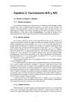 Departamento de Electrónica A-704 Electrónica III Capítulo 2: Conversores D/A y A/D 2.1. Señales analógicas y digitales 2.1.1. Señales analógicas Son variables eléctricas que evolucionan en el tiempo en forma análoga a alguna variable física. Estas variables pueden presentarse en la forma de una corriente, una tensión o una carga eléctrica. Varían en forma continua entre un límite inferior y un límite superior. Cuando estos límites coinciden con los límites que admite un determinado dispositivo, se dice que la señal está normalizada. La ventaja de trabajar con señales normalizadas es que se aprovecha mejor la relación señal/ruido del dispositivo. 2.1.2. Señales digitales Son variables eléctricas con dos niveles bien diferenciados que se alternan en el tiempo transmitiendo información según un código previamente acordado. Cada nivel eléctrico representa uno de dos símbolos: 0 ó 1, V o F, etc. Los niveles específicos dependen del tipo de dispositivos utilizado. Por ejemplo si se emplean componentes de la familia lógica TTL (transistor-transistor-logic) los niveles son 0 V y 5 V, aunque cualquier valor por debajo de 0,8 V es correctamente interpretado como un 0 y cualquier valor por encima de 2 V es interpretado como un 1 (los niveles de salida están por debajo de 0,4 V y por encima de 2,4 V respectivamente). En el caso de la familia CMOS (complementary metal-oxide-semiconductor), los valores dependen de la alimentación. Para alimentación de +5 V, los valores ideales son también 0 V y 5 V, pero se reconoce un 0 hasta 2,25 V y un 1 a partir de 2,75 V. Estos ejemplos muestran uno de los principales atractivos de las señales digitales: su gran inmunidad al ruido. Las señales digitales descriptas tienen la particularidad de tener sólo dos estados y por lo tanto permiten representar, transmitir o almacenar información binaria. Para transmitir más información se requiere mayor cantidad de estados, que pueden lograrse combinando varias señales en paralelo (simultáneas), cada una de las cuales transmite una información binaria. Si hay n señales binarias, el resultado es que pueden representarse 2n estados. El conjunto de n señales constituye una palabra. Otra variante es enviar por una línea única, en forma secuencial, la información. Si se sabe cuándo comienza, y qué longitud tiene una palabra (conjunto ordenado de estados binarios que constituye un estado 2n-ario), se puede conocer su estado. El hecho de que una señal digital pueda tener 2n estados, no nos dice nada respecto a qué significa o cómo se interpreta cada estado. Como veremos a continuación, esta interpretación depende, realmente, del código utilizado. 2.1.3. Códigos binarios Habitualmente los códigos binarios representan números (que a su vez representan valores que va asumiendo una variable física o eléctrica), o bien señales de control, de mando o de estado (informando sobre el estado de una operación o proceso). Nos inte1 Departamento de Electrónica A-704 Electrónica III resa aquí el primer caso, es decir la representación de números. Aún así, hay diversas correspondencias posibles, que examinaremos a continuación. 2.1.3.1. Código binario natural Se basa en el concepto de numeración posicional con ponderación. Si dn, ... ,d1 son valores 0 ó 1, entonces dndn-1...d1 ↔ dn 2n-1 + dn-1 2n-2 + ... + d1 Por ejemplo, 10001101 ↔ 128 + 8 + 4 + 1 = 141. Los valores ak se denominan bits (del inglés binary digit). El bit an se denomina bit más significativo, y se abrevia MSB (siglas del inglés, most significant bit). El bit a1 se denomina bit menos significativo, y se abrevia LSB (siglas del inglés, least significant bit). 2.1.3.2. Código binario complementario Es igual al anterior pero cada bit está invertido. Se utiliza en ciertos casos en que se trabaja con valores lógicos inversos: dn dn-1...d1 ↔ (1 – dn) 2n-1 + (1 − dn-1) 2n-2 + ...+ (1 − d1) En este ejemplo, 01110010 ↔ 141. 2.1.3.3. Código decimal binario (BCD) Se usan grupos de 4 bits (nibbles) pero se utilizan hasta el 9 (1001) De esa manera pueden representarse números decimales en forma cómoda con números binarios. Por ejemplo: 0111 0011 0010 ↔ 732 Es un código muy utilizado en los casos en que se debe excitar directamente un display o indicador con dígitos decimales, por ejemplo en un multímetro digital. 2.1.3.4. Códigos bipolares Se utilizan para representar señales alternas o que pueden tener tanto signo positivo como negativo. 2.1.3.4.1. Código con bit de signo Utiliza el bit más significativo como bit de signo que afecta a los otros bits. Siempre tiene un dígito más que los necesarios para representar el valor absoluto del número. Por ejemplo, en un código de 4 bits: 00111 ↔ +7 10111 ↔ −7 2 Departamento de Electrónica A-704 Electrónica III La desventaja es que no puede manejarse en forma puramente algebraica. Por ejemplo, la suma de dos números negativos debe hacerse con reglas diferentes para el bit más significativo que para el resto. Otra desventaja es que el 0 tiene dos representaciones según que se lo interprete como +0 y –0. La ventaja es la simetría de la representación de números de distinto signo e igual magnitud. Una aplicación habitual son los voltímetros y otros instrumentos digitales, ya que permiten efectuar la decisión sobre la polaridad mediante un comparador, y alimentar directamente el control del segmento del display que representa el signo.. 2.1.3.4.2. Código binario desplazado (offset binary) Es similar al código binario pero desplazado de modo que el valor 00...0 representa el valor más negativo y 11...1 el más negativo, siendo el 10...0 correspondiente al 0. En general va desde –2n-1 a 2n-1 –1. Por ejemplo, en un código de 4 bits: 1111 ↔ 7 1000 ↔ 0 0000 ↔ -8 2.1.3.4.3. Código de complemento a 2 En este código los números positivos se representan igual que en el código binario natural y los negativos complem