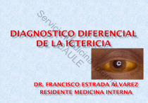 ci i rv Se a rn te In a in ic E ed L M U o CA DR. FRANCISCO ESTRADA ALVAREZ RESIDENTE MEDICINA INTERNA ci i rv Se a rn te In a in ic E ed L M U o CA la pigmentación que se produce en la piel cuando la bilirrubina plasmática supera los 2-2,5 mg/dl. ci i rv Se In a in ic E ed L M U o CA sólo se produce cuando hay hiperbilirrubinemia sérica a rn te •representa un signo de hepatopatía o, con menos frecuencia, de un trastorno hemolítico. ci i rv Se In a in ic E ed L M U o CA Si en la exploración se detecta ictericia en las escleróticas, la bilirrubina sérica es, por lo menos, de 3.0 mg/100 ml. • La ictericia en las escleróticas es más difícil de identificar cuando el examen se realiza en una habitación con luz fluorescente. El siguiente paso es examinar la región sublingual a rn te Incluso toma una coloración verdosa si la ictericia es de larga evolución • el color verde se debe a la transformación de la bilirrubina en biliverdina por un proceso de oxidación. ci i rv Se In a in ic E ed L M U o CA La bilirrubina es el principal producto resultante del catabolismo del grupo Hem de la hemoglobina. La bilirrubina procede en un 85% de la destrucción de los hematíes maduros, y el 15% restante de la eritropoyesis ineficaz y del catabolismo de hemoproteínas tisulares. a rn te La bilirrubina es conjugada a nivel hepático por la UDPglucuroniltransferasa (UDP-GT), posteriormente excretada por la vía biliar y finalmente llega al intestino donde entra a formar parte de la circulación enterohepática. •En condiciones normales, los niveles séricos de bilirrubina son inferiores a 1 mg/dl i rv Se ci Cuando existe aumento de la bilirrubina directa (BD) o conjugada, hidrosoluble y que por lo tanto se elimina por vía renal, se produce una coloración oscura de la orina (coluria) e hiperpigmentación fecal (pleiocromía), In a in ic E ed L M U o CA Por el contrario, la bilirrubina indirecta (BI) o no conjugada es liposoluble y no aparece en la orina, por lo que su aumento no ocasiona coluria. a rn te En la obstrucción biliar, la ausencia de pigmentos biliares en la luz intestinal provoca la ausencia de pigmentación de las heces, ya sea completa (acolia) o parcial (hipocolia). ci i rv Se a rn te In a in ic E ed L M U o CA i rv Se ci Además de la ictericia, la piel se tiñe de amarillo In a in ic E ed L M U o CA a rn te •En la carotenodermia •Con el consumo del fármaco llamado quinacrina •Al exponerse excesivamente a los fenoles. i rv Se ci La carotenodermia In a in ic E ed L M U o CA • Color amarillo que producen los carotenos en la piel • Se observa en individuos sanos que ingieren cantidades excesivas de verduras y frutas que contienen carotenos: • zanahorias, verduras foliáceas, calabacitas, melocotones y naranjas. • El color amarillo NO se reparte homogéneamente por todo el cuerpo No tiñe las escleróticas a rn te El pigmento de los carotenos se concentra en las palmas, las plantas, la frente y los pliegues nasolabiales. ci i rv Se a rn te In a in ic E ed L M U o CA i rv Se ci La quinacrina colorea la piel de amarillo en un 4 a 37% de los pacientes que la consumen. In a in ic E ed L M U o CA a rn te A diferencia de los carotenos, puede teñir las escleróticas i rv Se Historia clínica y de la exploración física del paciente. ci In a in ic E ed L M U o CA La realización de estudios analíticos confirma el diagnóstico sindrómico, y en algunos casos establece la etiología de la enfermedad. realización de pruebas diagnósticas no invasivas, como son la ecografía abdominal, la colangioRM, y la TAC. a rn te En un último escalón diagnóstico figuran la ecoendoscopia y la biopsia hepática. La CPRE cada vez más es una técnica orientada a la realización de procedimientos diagnósticos en relación a la toma de biopsias, y a la realización de terapéutica ci i rv Se In a in ic E ed L M U o CA Anamnesis a rn te •Coluria: hiperbilirrubinemia mixta o conjugada •Ausencia de coluria es signo de hiperbilirrubinemia no conjugada. •Acolia i rv Se ci Antecedentes personales. In a in ic E ed L M U o CA a rn te • Ingesta etílica • Exposición a tóxicos ambientales • Ingesta de fármacos hepatotóxicos o colestásicos. Toma de hierbas medicinales • Transfusiones previas, trasplante, uso de drogas intravenosas. • Contactos epidemiológicos y viajes. • Embarazo, infección VIH, insuficiencia cardiaca • Diabetes de reciente comienzo (carcinoma de cabeza de páncreas) • Cirugía de la vía biliar, Hª de cólicos • Historia de enfermedades de base autoinmune o historia familiar de ictericia o enfermedad hepática o trastornos hemolíticos. i rv Se ci Inicio y curso de la ictericia In a in ic E ed L M U o CA a rn te • Brusco y progresivo en las hepatitis agudas • Brusco y oscilante en la colédocolitiasis, • Progresión rápida en las neoplasias de cabeza de páncreas • Progresión lenta en las colestasis crónicas. • Curso intermitente puede aparecer en las obstrucciones de la vía biliar por litiasis móvil y en las ictericias de causa hereditaria. i rv Se ci Sintomatología asociada. In a in ic E ed L M U o CA a rn te • Pródromos de infección viral: malestar general, mialgias, anorexia, náuseas, vómitos y molestias abdominales sugiere hepatitis viral • Dolor abdominal intenso en hipocondrio derecho: litiasis biliar • Síndrome constitucional : Neoplasia y hepatopatías terminales • Fiebre obliga a descartar cuadros infecciosos : hepatitis viral, sepsis bacteriana • Prurito intenso: Colestasis i rv Se ci Exploración física In a in ic E ed L M U o CA Signos de hepatopatía crónica (telangiectasias, arañas vasculares, eritema palmar, ginecomastia, asterixis), etilismo (hiperplasia parotídea, Dupuytren) o hipertensión portal (ascitis, circulación colateral). La hiperpigmentación cutánea : hemocromatosis xantelasmas : CBP a rn te el anillo de Kayser-Fleischer en la enfermedad de Wilson. ci i rv Se In a in ic E e