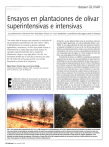 dossier OLIVAR ^ Ensayos en plantaciones de olivar superintensivas e intensivas Las plantaciones intensivas bien diseñadas ofrecen un futuro productivo y económico más seguro para el olivarero Tras varios años de ensayo para comprobar la evolución de las plantaciones superintensivas de olivar (entre 1.500 y 2.500 plantas/ha) se constata su dudosa viabilidad agronómica y económica y lo difícil que podría resultar su mantenimiento a medio-largo plazo (dato todavía no calculado experimentalmente por la insuficiente información a largo o muy largo plazo). Por ello, nos inclinamos siempre por la olivicultura intensiva con calles de 7-8 metros de ancho para permitir una correcta iluminación y el paso de la maquinaria. Miguel Pastor, Victorino Vega y Juan Carlos Hidalgo. CIFA Alameda del Obispo. Córdoba. IFAPA. Consejería de Innovación, Ciencia y Empresa. Junta de Andalucía. n diferentes medios de comunicación se presenta a las plantaciones superintensivas como el único modelo de cultivo mecanizado y rentable sin subvenciones de la UE, partiendo de la hipótesis de que únicamente con una mecanización integral de la recolección puede lograrse una adecuada rentabilidad en el cultivo del olivar, lo cual es una atrevida afirmación, ya que determinados tipos de olivicultura intensiva permiten lograr, igualmente, una alta rentabilidad (Pastor y col., 1998). Es una vieja aspiración de todos los olivareros encontrar un paquete tecnológico en el que se dé una técnica que permita obtener una máxima producción, unida a unos mínimos costes de implantación y de cultivo, así como a la posibilidad de disponer de una maquinaria capaz de lograr un mínimo empleo de mano de obra, cuyo coste grava enormemente a este cultivo. En definición de Tous y col. (2003) se entiende por plantación superintensiva de olivar una inversión (grande en este caso) con rentabilidad a muy corto plazo (alrededor de diez años), que emplea una alta densidad de plantación (entre 1.500 y 2.500 plantas por hectárea) y cuyo principal interés radica en aprovechar la alta eficacia de una máquina cosechadora cabalgante durante los primeros años de la vida del olivar, lo que se traduce en unos teóricos bajos costes de recolección, aspecto éste que habría que matizar en toda su extensión. Por el contrario, este tipo de plantación tiene unos elevados costes de implantación y de cultivo y requiere unos condicionantes técnicos muy especiales, tales como disponer de variedades poco vigorosas, explotaciones de cierta dimensión y terrenos poco accidentados, regadío con abundante disponibilidad de agua y, como es natural, disponer de la máquina cosechadora (tiene un muy alto coste de adquisición) o, en su defecto, poder alquilarla, lo que limita la expansión de este modelo de olivicultura a situaciones agronómicas muy concretas. ^^ ^..r-^^® Foto 1. A la izquierda olivar superintensivo (3,5 x 1,5 m=1.900 olivos/ha) de la variedad Arbequina al final de la primera estación de crecimiento. Los árboles se han formado con un eje central y se ha forzado su crecimiento vertical con ayuda de un entramado de alambres que dan la suficiente verticalidad y rigidez a los tutores (en este caso varillas metálicas de 6 mm de diámetro y 2 metros de alto) a los que se ha ido atado la terminal de dicho eje central o guía a medida que se iba produciendo el crecimiento en altura de los jóvenes olivos; las intervenciones manuales de atado y poda se han realizado de forma continuada a lo largo de toda la campaña. Igualmente se han eliminado las ramas laterales más vigorosas. A la derecha, el mismo olivar al final de la segunda estación de crecimiento, cuando ya se habían producido los primeros frutos. EI año siguiente se obtendría la primera gran cosecha de esta plantación. 30/Vida Rural/1 de noviembre 2005 ^ OLIVAR dossier ^ primeros años de la plantación _ , ^ ^ intensiva En los primeros cinco o seis años, en zonas de buen suelo y clima, y en regadío, este tipo de plantaciones puede proporcionar producciones de aceitunas interesantes, y las máquinas cosechadoras cabalgantes realizan un trabajo cuya calidad es muy aceptable (Tous y col., 2003) siempre que: - La poda de formación/producción sea la más adecuada, de modo que podamos conseguir una forma y tamaño de los árboles de acuerdo con las posibilidades de trabajo de la máquina cosechadora. - Los árboles sean jóvenes y la rigidez de las ramas permita el paso de la cosechadora sin romperlas. Recordamos que en el trabajo de recolección, y durante unos segundos, el árbol queda dentro de la máquina, ocupando un espacio relativamente reducido y estrecho, y los olivos son golpeados enérgicamente por batidores o por varas mecánicas con las que van equipadas las cosechadoras, con lo que se logra un aceír table porcentaje de derribo de los frutos. Pero ello solamente es fácil de conseguir durante los primeros años de la vida de la plantación; digamos que éste es el primer capítulo de una novela por entregas. En los primeros años los olivos están recién plantados y no hay más que hacerlos crecer en forma plana mediante una técnica apropiada, a partir de una forma en eje central, lo cual puede conseguirse realizando una adecuada poda continuada a lo largo del período vegetativo. De este modo y con ayuda del agua de riego y los fertilizantes, es posible obtener al tercer año una buena producción, que además es fácilmente recolectable con la máquina cosechadora cabalgante, producción que se mantiene a lo sumo tres o cuatro años, decayendo a continuación cuando los árboles empiezan a competir entre ellos por la luz. Los siguientes capítulos de esta novela por entregas y el desarrollo final de su trama parecen ser ignorados por los "apóstoles" del sistema. Pero, ^seremos capaces de mantener productivo este olivar el suficiente número de años como para lograr amor- , , ^^^ ^ :^^ ^^^ ^^ ^^ .^^ ^^^ ^^^ ^. ,. ^^ Plantaciones superi