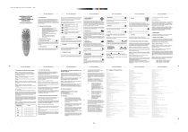 jd74413_sky_leaflet.FH9 Thu Oct 14 10:14:59 2004 Page 1 C SKY-URC-60050B00-00 INSTRUCTIVO DE OPERACIÓN CONTROL REMOTO UNIVERSAL SKY-URC-60050B00-00 1. Introducción: El control remoto SKY-URC-60050B00-00 ha sido diseñado para controlar el Receptor Digital SKY+, así como varias marcas de televisores, DVDs, video grabadoras y componentes de audio. Conserva este instructivo para el funcionamiento y programación de tu control remoto. SKY-URC-60050B00-00 NOTA: Para programar las teclas de los componentes electrónicos sigue los puntos 4 o 6. Coloca al control remoto en modo de televisión. 2. Instalación de baterías: 1. 2. 3. 4. Coloca al control remoto en modo de DVD. En la parte trasera del control remoto, remueve a tapa de baterías. Coloca las pilas doble AA 1.5V (ya incluidas ) igualando la polaridad de las baterías con las marcas (+) y (-) que se encuentran impresas dentro del compartimiento. Desliza la tapa de baterías de vuelta a su lugar. En caso de mal funcionamiento o nulo, debes cambiar las pilas por unas nuevas. 3. Descripción de teclas: ENCENDIDO/APAGADO Permite encender o apagar el componente electrónico que estés operando, presiona una vez para encender o apagar Coloca al control remoto en modo de AUX. Coloca al control remoto en modo de Satélite, para controlar tu Receptor Digital. GUIDE En modo SKY, permite ingresar a la Guía de Programación en Pantalla. CONFIGURACIÓN Permite acceder a las secuencias de programación de las teclas de los componentes electrónicos. En todos los modos, permite subir (+) o bajar (-) el nivel de audio del Receptor Digital y demás componentes electrónicos. CAMBIO DE CANAL En modo SKY y TV, permite sintonizar el canal inmediato superior o inmediato inferior del canal sintonizado. CM MY CY CMY DESPLAZAMIENTO (NAVEGADOR) En modo SKY, estas teclas (flechas) permiten el desplazamiento a través de las celdas de los mosaicos, menús, submenús, Guía de Programación en Pantalla, entre otros. La tecla central, permite confirmar una elección, un cambio, comprar un evento de Pago por Evento Automático (IPPV), entre otros. En modo TV, DVD, AUX, permiten el desplazamiento por los menús de configuración que haya disponibles y confirmar una opción o cambio. INFORMACIÓN K SKY-URC-60050B00-00 REGRESAR SINOPSIS / AUDIO ALTERNO En modo SKY, permite desplegar la sinopsis disponible (aplican restricciones) del programa o película. Así como cambiar el Audio Alterno y Subtítulos de los programas y películas (aplican restricciones). SKY PREMIERE En modo SKY, tecla reservada para funcionalidad futura. APLICACIONES INTERACTIVAS En modo SKY, permite ingresar a las Aplicaciones Interactivas que SKY tenga disponibles (aplican restricciones). En todos los modos, permite regresar a la pantalla inmediata anterior de un menú. MOSAICO En modo SKY, permite dar ingreso al mosaico 100, o en su caso al mosaico de default. En modo SKY, permite ir de manera directa, del Navegador SKY a la sintonía normal del canal y viceversa. En modo TV, DVD, AUX, permite remover las funciones desplegadas en pantalla. SERVICIOS INTERACTIVOS En modo SKY, permiten operar los servicios interactivos que SKY tenga disponibles (aplican restricciones). GRABACIÓN Y REPRODUCCIÓN DE PROGRAMAS GRABADOS En modo SKY, permite entre otras cosas la grabación y reproducción de Programas Grabados (aplica sólo para Receptores Digitales modelo DVR 830i). En modo DVD y AUX, permite operar estas teclas de la manera habitual. En todos los modos, permite desactivar o activar el audio de tu Receptor Digital y demás componentes electrónicos. 6. Programación Manual de Códigos Paso 1. Busca el código que corresponda al componente electrónico que deseas controlar de acuerdo a su marca en la sección de Códigos de Programación, Punto 12. Paso 2. Enciende manualmente el componente electrónico (TV, DVD, AUX, SKY). Paso 3. Presiona la tecla del modo que decidiste controlar. Paso 4. Presiona y mantén por 3 segundos la tecla SET hasta que la tecla del modo seleccionado destelle dos veces. Paso 5. Digita el código de cuatro dígitos correspondiente al componente electrónico y marca indicada. ¿La tecla del modo seleccionado destelló dos veces? Si. Ve al paso 6. No. Repite el procedimiento, el código fue inválido. Paso 6. Apunta el control remoto hacia el componente electrónico y presiona la tecla ENCENDIDO/APAGADO para apagarlo y confirmar que tu control remoto está listo para operar con el componente electrónico seleccionado. NOTA: Si hay algún problema es probable que el código programado no sea el específico para el modelo del componente electrónico. Repite el procedimiento tantas veces sea necesario, de acuerdo a los códigos que haya disponibles. Paso 7. Escribe en la Tabla de Referencia los códigos de los componentes electrónicos que hayas programado para referencia rápida. Componente Electrónico TV DVD AUX SKY Código SKY-URC-60050B00-00 7. Control de Volumen Esta función te permite controlar el volumen del componente electrónico que desees, independiente del componente electrónico que se encuentre programado en ese momento. Por ejemplo: Si estás reproduciendo una película en tu DVD, esto es, en el modo de operación DVD, pero requieres controlar el volumen de tu TV, sin cambiar el modo de operación de DVD a TV, sólo tienes que realizar lo siguiente: Paso 1. Presiona la tecla de modo TV. Paso 2. Presiona y mantén por 3 segundos la tecla SET hasta que la tecla de modo TV destelle dos veces. Paso 3. Digita el código 9 9 3, la tecla de modo TV destellará dos veces. Paso 4. Presiona la tecla de modo TV, la tecla destellará dos veces como confirmación de que el control del volumen ha sido asignado al televisor. SKY-URC-60050B00-00 5) La cubierta externa y las partes decorativas del control remoto no están amparadas por esta garantía. 12. Códigos de Programación Si deseas restaurar el control de volumen a su estado original, es decir, que todos los component