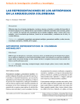 Las representaciones de los artrópodos la arqueología colombiana Artículo de investigación científica y en tecnológica LAS REPRESENTACIONES DE LOS ARTRÓPODOS EN LA ARQUEOLOGÍA COLOMBIANA Hugo A. Sotomayor Tribín MD* Resumen Diferentes tipos de artrópodos (miriápodos, crustáceos, insectos, arácnidos) y estadios del desarrollo de los insectos (pupas, larvas, adultos) fueron representados en diferentes materiales como cerámica, piedra y oro, a manera de expresión del conocimiento que los pueblos indígenas tenían y tienen sobre estos animales, y por la asociación que hicieron y hacen de sus características y conductas con la vida y la sociedad humana. Palabras clave: artrópodos, arqueología, pensamiento analógico, pensamiento analítico, arañas, insectos, escarabajos, mariposas, crisálidas, larvas, pupas. ARTHROPOD REPRESENTATIONS IN COLOMBIAN ARCHAELOGY Abstract Different types of arthropods (i.e: myriapods, crustaceous, insects, arachnida) and insect development forms (pupas, larvae, adults) were displayed on various materials including ceramics, stone and gold as an expression of indigenous people ancient and present ideology on these animals and due to metaphors between their characteristics and behavior and life and human society. Key words: arthropods, archaeology, analogical thought, analytic thought, spiders, insects, beetles, butterflies, chrysalis, larvae, pupas. Introducción Pensamiento analógico, pensamiento analítico: los pueblos indígenas del pasado y presente de lo que hoy es Colombia en virtud del chamanismo y por su estrecha dependencia con las fuerzas de la naturaleza, se valieron de procesos de comparación y analogías sistemáticas entre los diversos aspectos de la vida de los animales, de las plantas, de los seres inanimados y de los aspectos generales de su entorno, para explicar la vida de ellos mismos como individuos y como sociedades. Este tipo Fecha recibido: junio 8 de 2010 Fecha aceptado: julio 1 de 2010 208 Repertorio de Medicina y Cirugía. Vol 19 Nº 3 2010 de pensamiento de contraste, totalizante, comparativo, asociativo y analógico, es el que en otras perspectivas políticas, históricas y científicas se ha llamado con diferentes nombres como primitivo y mágico, para oponerlo al que hoy se llama científico o analítico. El pensamiento analógico contrasta entre macho y hembra, arriba y abajo, derecho e izquierdo, día y noche, adelante y atrás, blanco y amarillo; azul y rojo, mate y brillante, pequeño y grande; claro y oscuro; externo e interno; cálido y frío, seco y húmedo, oro y plata, sol y luna, * Profesor de Historia de la Medicina y Antropología Médica, Facultad de Medicina Fundación Universitaria de Ciencias de la Salud. Curador del Museo de la Sociedad de Cirugía de Bogotá. Bogotá D.C. Colombia. Repert.med.cir. 2010;19(3):208-214 Las representaciones de los artrópodos en la arqueología colombiana presencia y ausencia, duro y blando, dulce y amargo, dócil y díscolo, visibilidad e invisibilidad, vigilia y sueño, volar y reptar, etc. El pensamiento analógico le da un gran valor a la metamorfosis que sufren ciertos animales, como ocurre con algunos insectos y batracios. mérica, según el estilo del arte de cada uno de los pueblos. Los diversos grupos que habitaron lo que hoy es Colombia dejaron bellas y realistas representaciones de diferentes animales esculpidas y talladas en oro, hueso, piedras, cerámica, conchas, nácar, etc. Al vivir ellos en una estrecha asociación con el resto de seres de la naturaleza, desarrollaron extraordinarios conocimientos sobre su entorno animal, vegetal y de seres animados, que hoy son aprovechados por los ecologistas y los etólogos. Así, partiendo del pensamiento sistémico, comparativo, ecológico y etológico es como debemos tratar de entender los restos arqueológicos y las mitologías en donde figuran los artrópodos. Alrededor de las ofrendas que los indígenas muiscas del altiplano cundiboyacense, Lucas Fernández de Piedrahita, autor de Noticia Historial de las Conquistas del Nuevo Reino de Granada, escribió: Los artrópodos: para efectos de la compresión del texto que sigue es necesario definir qué son los artrópodos y cómo está subdividido este filo de animales. Son un conjunto de invertebrados con un exoesqueleto formado por cutículas y su cuerpo está dividido en una serie lineal de segmentos. A este filo de animales, el más numeroso que existe, pertenecen las siguientes clases: insectos, miriápodos, crustáceos y arácnidos. Los insectos se caracterizan por tener tres pares de patas y antenas; los miriápodos por muchos pares de patas y antenas; los crustáceos con cinco pares de patas de los cuales el primero puede estar transformado en pinzas, tener antenas y la mayoría de ellos viven en el agua; los arácnidos tienen cuatro pares de patas, el primero puede estar conectado a glándulas venenosas y no tener antenas. Ejemplos de los insectos pueden ser las moscas, mosquitos, saltamontes, mariposas, libélulas, avispas, abejas, hormigas, triatomíneos, cucarrones, pulgas, piojos, etc. Entre los miriápodos están los ciempiés y milpiés; en los crustáceos figuran los cangrejos, camarones, langostinos y las gambas; y entre los arácnidos figuran como ejemplos los escorpiones, arañas, garrapatas, ácaros, etc. Material Las representaciones de los artrópodos y otros animales en las ofrendas votivas y funerarias Dentro de las ofrendas que hicieron los diferentes conglomerados indígenas hubo objetos que representaron diferentes animales en forma realista, abstracta o qui- hacían las ofrendas a sus ídolos, de esmeraldas, oro en polvo o en puntas, y así mismo de diferentes figuras de culebras, sapos, lagartijas, hormigas y gusanos; casquetes, brazaletes, diademas, monas, raposas y vasos, todo de oro; ofrecían también tigres, leones y otras cosas de menos importancia, como son pájaros y vasijas de barro, con mantenimiento o sin ellos. Los artró