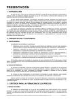 PRESENTACIÓN 1.- INTRODUCCIÓN En este año 2013, "Precio de la Construcción CENTRO" cumple 29 años de publicación ininterrumpida y continúa siendo una referencia obligada para todos los que de forma directa o indirecta están implicados en los proyectos y ejecución de obras privadas y públicas. En esta edición hemos pretendido, como siempre, actualizar los precios, ajustarnos a los cambios que se han producido en el mercado, mejorando la Base de Datos, incorporando nuevos precios de unidades de obra y cumpliendo las nuevas normativas vigentes. Se han adaptado las unidades de obra a los valores y requisitos requeridos por el CTE. Así también se ha desarrollado la Base de Datos ampliando su contenido en relación a productos sostenibles, energías renovables y tecnología led adaptándose a las exigencias que cada vez son mayores en algunos países de la Unión Europea y en nuestro país. Los precios que integran la publicación son orientativos, debiendo considerar que el precio real depende de variables tales como disponibilidad de mano de obra, volumen contratado, complejidad y accesibilidad de la obra, además de la libre competencia que puede condicionar el precio final. Por todo ello, los precios de la base se han elaborado bajo unos supuestos de obra que consideramos "tipo" con unas condiciones medias, de las variables antes señaladas, así como la distancia a los suministros y la disponibilidad en el mercado tanto de materiales como de mano de obra. 2.- PRESENTACIÓN Y CONTENIDOS 2.1. EDICIÓN IMPRESA La publicación se ha dividido en cuatro tomos: 1. “Materiales, precios resumidos”. Recoge los precios básicos de materiales, mano de obra, maquinaria, medios auxiliares y precios descompuestos resumidos de Edificación, Urbanización y Rehabilitación. 2. “Edificación”. Desarrolla los precios unitarios de edificación, descomponiéndolos y definiendo las características y cuantías de los elementos que intervienen en su formación. 3. “Urbanización”. Desarrolla los precios unitarios de urbanización u obra civil, descomponiéndolos y definiendo las características y cuantías de los elementos que intervienen en su formación. 4. “Rehabilitación”. Desarrolla los precios unitarios de rehabilitación, descomponiéndolos y definiendo las características y cuantías de los elementos que intervienen en su formación. En la edición impresa se ha aplicado un porcentaje de costes indirectos del 3%, si bien, queda a criterio técnico su imputación en la forma y cantidad que estime conveniente de acuerdo con las características de cada obra en particular. 2.2 EDICIÓN INFORMÁTICA Se presenta en DVD-ROM, en formato de intercambio estándar FIEBDC-3, compatible con los programas de mediciones y presupuestos existentes en el mercado, permitiendo un acceso rápido a la base de datos por medio de un visualizador, así como a imágenes de diferentes materiales y unidades de obra y detalles constructivos de muchas unidades de obrar que componen la base. En la base de datos informatizada no está incluido el porcentaje de costes indirectos, estos deberán establecerse dependiendo de la tipología constructiva, en los programas de mediciones y presupuestos. Además contiene un Pliego de Condiciones Técnicas de edificación y urbanización, con textos asociados a las diferentes partidas que intervienen en la obra, actualizado según el Código Técnico de la Edificación (C.T.E.) y normativa vigente. 3 .- CRITERIOS PARA LA FORMACIÓN DE LOS PRECIOS 3.1 MANO DE OBRA Se desarrolla una tabla salarial, en la que se han considerado una media nacional de los convenios colectivos, a la que se ha incrementado una retribución voluntaria para acercar los precios a un valor medio de mercado. Las diferencias pueden ser importantes en función de la situación geográfica y el emplazamiento de cada obra. Colegio Oficial de Aparejadores, Arquitectos Técnicos e Ingenieros de Edificación / Gabinete Técnico Aparejadores Guadalajara, S.L.U. / 2013 Presentación - 1 3.2 MAQUINARIA Y MEDIOS AUXILIARES La valoración de la maquinaria se hace en función de la utilización de la misma para la unidad de obra que se ha de valorar considerando el alquiler, el consumo energético o de combustible y el personal fijo que la maneja. Los medios auxiliares se valoran según la función a la que están dedicados siendo necesarios para la realización de la partida de obra en que intervienen. 3.3 PRODUCTOS Y MATERIALES Se han utilizado los precios de venta al público de las tarifas de los fabricantes. En todo caso habría que considerar los descuentos a realizar, que suelen depender del volumen de la adquisición, forma de pago, etc., así como la situación, emplazamiento de la obra o valores del mercado. 3.4 PRECIOS DESCOMPUESTOS Se han obtenido con los precios de los materiales y auxiliares, los rendimientos medios para cada operación considerando que su ejecución se realiza en buenas condiciones de trabajo, por personal especializado y con los medios auxiliares necesarios. La descomposición comienza por los conceptos de mano de obra y maquinaria, seguida de los precios de los materiales y/o de precios auxiliares necesarios. Todos los precios descompuestos tienen un texto descriptivo de la unidad de obra que se trata. En él se detallan los criterios de ejecución más relevantes, los materiales empleados, dimensiones y espesores, así como la normativa y los criterios de medición. 4.- CODIFICACIÓN Cada uno de los conceptos incluidos tiene asignado un código de hasta nueve caracteres que se divide en cuatro bloques: BLOQUE 1 Está formado por un solo carácter (una letra mayúscula) que define el tipo de precio de que se trata y puede ser: O: Mano de Obra M: Maquinaria P: Precio básico A: Precio auxiliar E: Precio unitario descompuesto de Edificación U: Precio unitario descompuesto de Urbanización y Obra Civil R: Precio unitario descompuesto de Rehabilitación y Restauración. BLO