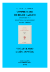 C. IVLII CAESARIS COMMENTARII DE BELLO GALLICO EX LIBRIS I, IV, V DISCIPVLIS LEGENDA EDIDIT HANS H. ØRBERG VOCABULARIO LATÍN-ESPAÑOL DOMVS LATINA CULTURA CLÁSICA MMVII 1 ABREVIATURAS abl ac adj adv comp conj dat f fut gen ger ablativo acusativo adjetivo adverbio comparativo conjunción dativo femenino futuro genitivo gerundio/gerundivo indecl inf m n pas perf pl prp sg subj sup indeclinable infinitivo masculino neutro pasivo perfecto plural preposición singular subjuntivo superlativo Las palabras que faltan están en el Vocabulario Latín-Español I, correspondiente a LINGVA LATINA PER SE ILLVSTRATA PARS I: FAMILIA ROMANA CAESAR: DE BELLO GALLICO ex libris I, IV, V edidit Hans H. Ørberg VOCABULARIO LATÍN-ESPAÑOL © Hans H. Ørberg, Domus Latina, 2007 www.lingua-latina.dk Revisión del léxico castellano: © Emilio Canales & Antonio Glez. Amador CULTURA CLÁSICA, 2007 www.culturaclasica.es 2 aestus -ūs m, marea af-flīctāre, golpear, romper af-flīgere -xisse -ctum, golpear, averiar af-fore inf fut = af-futūrum esse < ad-esse Āfricus -ī m, ábrego (viento SO) ager agrī m, campo, territorio agere (cum, inter sē), hablar, tratar agger -is m, terraplén ag-gredī -ior -gressum, atacar ag-gregāre, sē, agregarse, unirse alacer -cris -cre, presto, fogoso alacritās -ātis f, fuego, ardor alere -uisse altum, alimentar aliēnus -a -um, intempestivo, desventajoso ali-quam-diū adv, algún tiempo ali-quī = aliquis, alguien alius aliā ex nāvī, uno de una nave, otro de otra altitūdō -inis f, altura, profundidad ambō -ae -ō, los dos (juntos) ammentum -ī n, correa amplitūdō -inis f, grandeza amplius adv, más amplus -a -um, amplio, grande anceps -cipitis adj, indeciso ancora -ae f, ancla, áncora angulus -ī m, ángulo, esquina angustiae -ārum f pl, estrechez, desfiladero angustius adv comp, más apretado; más escaso animus: in animō est +dat, tiene la intención; animum advertere, observar; animī causā, por gusto annōtinus -a -um, de un año ānser -eris m, ganso ante adv, antes ante-cēdere, ir delante ante-currere. correr delante antecursōrēs -um m pl, avanzada ante-ferre, preferir ante-pōnere, anteponer apertus -a -um, abierto, descubierto ap-pellere -pulisse -pulsum, dirigir aptus -a -um (ad), apropiado aqua -ae f, agua, reloj de agua aquārī, coger agua aquātiō -ōnis f, provisión de agua A ab/ā (mīlibus passuum...), a una distancia de ab-dere -didisse -ditum, ocultar ab-esse, nōn multum abest quīn +subj, falta poco para que abies -etis f, abeto ab-sistere, alejarse abs-tinēre, abstenerse ac ver atque ac-cēdere, añadirse; accēdit quod /ut, a esto se añade que accersere -īvisse -ītum, llamar, hacer venir āctuārius -a -um, (nāvis) rápido (con velas y remos) ad (: ferē), unos..., cerca de ad-aequāre, igualarse a ad-dūcere, llevar; in cōnsuētūdinem a., acostumbrar; adductus +abl, inducido, incitado ad-eō, hasta tal punto, tanto ad-haerēre -sisse -sum, adherirse ad-hibēre, aplicar, llevar ad-hortārī, exhortar, alentar ad-igere -ēgisse -āctum, empujar, disparar ad-ipīscī -eptum, alcanzar, obtener aditus -ūs m, acceso, llegada adiūtor -ōris m, ayudante ad-ministrāre, cuidar, organizar ad-mittere, admitir, soltar; equō admissō, a galope tendido ad-modum adv, mucho, altamente, nada menos que ad-monēre, advertir, amonestar ad-orīrī, acometer, atacar adventus -ūs m, venida, llegada adversus -a -um: adversā nocte, la prima noche; in adversum ōs, en plena cara ad-vertere, animum a., observar ad-volāre, precipitarse aedificium -ī, edificio, granja aegrē adv, a (duras) penas, difícilmente; sup aegerrimē aequāre, igualar aequus -a -um, (locus) llano, liso, favorable; justo, equitativo aes aeris n, cobre, bronce 3 C aquili-fer -ferī m, abanderado, portaestandarte arbiter -trī m, árbitro, juez ārdēre -sisse, arder, ser ardiendo argilla -ae f, arcilla āridus -a -um, árido, seco; n tierra firme armāmenta -ōrum n pl, aparejo armāre, aparejar, equipar armātī -ōrum m pl, gente armada ar-ripere -iō -uisse -reptum, coger con prisa, agarrar ascēnsus -ūs m, ascenso, posibilidad de subir a-scīscere -īvisse -ītum, acoger asper -era -erum, áspero, penoso as-suē-facere, acostumbrar atque/ac: (pār/aliter/contrā) a., que at-texere -uisse -xtum, tejer at-tingere -tigisse -tāctum, tocar, alcanzar at-tribuere -uisse -ūtum, asignar auctor -ōris m, promotor, instigador, consejero: a. esse, aconsejar auctōritās -ātis f, autoridad, prestigio audācter adv, audazmente audītiō -ōnis f, rumor aurīga -ae m, cochero auxiliārī, prestar ayuda auxilium, dat auxiliō (venīre/ mittere), en auxilio ā-vertere. alejar, desviar; āversus, vuelto de espaldas avus -ī m, abuelo cadere cecidisse, caer (en la guerra) caeruleus -a -um, azul caespes -itis m, césped calamitās -ātis f, derrota capere (locum), ganar; cōnsilium capere, tomar una resolución captīvus -ī m, prisionero de guerra captus -ūs m, concepto caput (fluviī), desembocadura; capita pl, personas, individuos carrus -ī m, carro casa -ae f, cabaña, barraca castellum -ī n, fortaleza cāsus -ūs m, suceso, circunstancia, azar; cāsū, por casualidad causa -ae f, asunto, situación celeritās -ātis f, celeridad, rapidez cēnsus -ūs m, censo centuria -ae f, centuria (compañía, 1/6 de una cohorte) centuriō -ōnis m, centurión (oficial al mando de una centuria) certiōrem facere, enterar, informar; pas. certior fierī, enterarse cibāria -ōrum n pl, alimentos, víveres circu(m)-īre, ir alrededor circu-itus -ūs m, circuito, rodeo, circunferencia circum-cīdere, cortar circum-mittere, enviar por todas partes circum-sistere -stetisse, rodear circum-spicere, mirar alrededor circum-venīre, rodear cis prp +ac, del lado de acá de citātus -a -um, rápido citerior -ius, situado más acá, citus -a -um, rápido, pronto; adv citō, sup citissimē cīvitās -ātis f, ciudad, estado, ciudadanos (del estado) clādēs -is f, desastre, derrota clam adv, ocultamente, e