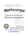 Forklift University Expertos de Instrucción de Carretilla Elevadora Capacitación del operador Manual de Seguridad Directrices OSHA Operaciones Seguras elevadoras Equipo de seguridad Check lista Operador del Sitio / Equipo de Evaluación www.ForkliftUniversity.com 1.10.07 1 Resúmenes de las Fatalidades de la Selección de Forklift Investigadas por la OSHA. • EMPLEADO GOLPEADO POR EL FORKLIFT: Empleado #1, un vendedor asignado a la terminal de marina, caminaba en el embarcadero junto a una maquina de la elevación de la taps del envase. Un Carro de forklift, con un accesorio del apretón llevando dos, rodillos de papel, viajaba en la misma dirección que el empleado #1. El carro de forklift continuo adelante y la carga (que era aproximadamente 11 pulgadas mas alta que la rueda de manejo) obstruyo al parecer la opinión delaritera del conductor. El golpeo y aplasto al empleado #1 debajo de la carga. • VOLVADURA DEL EL FORKLIFT: Mientras que un empleado estaba operando un forklift, el forklift se volcó mientras que el operador hacia al parecer una vuelta aguda a una velocidad excesiva. No se instalo el cinturón de seguridad y cuando el empleado se cayo de el asiento el fue aplastado por la barra de dar vueltas. • CAIDA DE LA PLATAFORMA EN EL FORKLIFT: La victima (empleado #1) fue encontrada prendida entre el mástil y el marco del forklift. Antes del accidente, el empleado #1 fue elevado 6 pies de alto aproximadamente por el operador del forklift mientras que el empleado estaba parado en una plataforma que no fue asegurada al marco del forklift. El operador dejo el forklift desatendida mientras que el empleado estaba en la plataforma vertido en una especie de un tanque de mezcla. • APLASTADO POR FORKLIFT: La Victima fue conducida dejando plantado el forklift en un remolque del tractor para comenzar a descargar cuando el conductor del carro jalo a lo lejos del muelle. El forklift cayó detrás sobre el conductor del forklift, golpeando su cabeza, y al parecer rompiéndose su cuello. • GOLPEADO POR EL FORKLIFT: Al empleado le dieron instrucciones de tomar el forklift para descargar un carro. El empleado levanto el forklift localizado en las premisas menos de una mitad milla de donde ocurrió el accidente. Viajando hacia debajo de una pendiente, el empleado procuro hacer una curva de la izquierda en una parte del estacionamiento, golpeo un bache en el camino, y el forklift comenzó a volcarse a la derecha. El empleado procuro saltar claramente de el forklift, pero fue golpeado y matado mientras que el forklift cayo. • GOLPEADO POR EL FORKLIFT: La victima fue asignada como el desecho de la descarga de el operador de el forklift y fue en la ruta de un descaramiento localizado en la alejada sección sureste en el exterior de el área de almacenaje de el material. La victima estaba utilizando un forklift estimado en 4500 libras. Una tolva de la 2 descarga de el metal, equipado con una manija de lanzamiento manual de la descarga, fue unido a las bifurcaciones de el forklift. La tolva fue llenada de las herpes del desecho. La victima coloco la carga sobre el lado del norte de el descargador. El desmonto el lado derecho de el forklift, lo más cerca posible a la pared del norte de el descargador, ya disparado la manija de la descarga de la tolva. Como el desmonte el no pudo fijar el freno de estacionamiento. Como la carga cayo repentinamente, al parecer el forklift se dio un tiron, causando la transmisión, la profundidad en el líquido, para deslizarse en la impulsión, y el lado derecho de la parte posterior de el forklift viaja hacia el descargador, sujetando la victima contra la pared del norte de el descargador. Una lesión golpea del cofre causando danos. La causa primaria de el accidente era que el empleado no pudo fijar el freno de estacionamiento antes de desmontar el encendido de el forklift. • GOLPEAR CON UNA CARGA QUE SE VOLTEA DE EL FORKLIFT: Un estibador es golpeado cuando una carga se derribar del panel de fibras de madera. Este cargo había sido escarado de un barco y acaba de estar en el muelle que aguardaba transferencia por el forklift a un almacén adyacente. El forklift intento levantar un apilado de tres empaques de cajones. La anchura de los empaque de cajones tenia. • EL FORKLIFFT SE VOLTEA CUANDO ES INICIADO EL REMOLQUE: Un empleado estaba detrás de la rueda de un forklift que era remolcado por un carro levantador operado por otro empleado de la compañía cuando el operador perdió el control de el forklift. El forklift viro del camino en una zanja, poniendo al operador por debajo. Antes de el accidente el forklift fue operacional y era conducido con las bifurcaciones por delante, en un camino de dos calles nuevamente pavimentado. El empleado en el carro agarro para arriba con el forklift, y os dos empleados decidían que ellos podrían conseguir apoyarse en el forklift en la ciudad mas rápida y conseguir al operador de el tiempo frió remolcando el forklift. Juntos unieron una correa de el remolque al contrapeso del el forklift y comenzaron a remolcar el forklift hacia abajo del camino en aproximadamente 15 a 18 millas por hora, con ola rueda de manejo al frente y las bifurcaciones en la parte posterior. En un ciento punto después de eso, el operador perdió el control de el forklift y viro del camino en una zanja a lo largo del lado del camino y movió de un tiron, eventual aterrizando de su lado con el operador sujetado por debajo. El forklift no fue equipado con los cinturones de seguridad. • CAIDA DE LA PLATAFORMA DE EL FORKLIFT: La victima se cayó aproximadamente 17 pies de una plataforma de trabajo 3 incorrecta mientras que estaba levantada en un carro industrial de 3 etapas (forklift). La plataforma de trabajo usada era una plataforma de madera de la aplicación colocada en el borde superior de las abrazaderas del apretón usadas para mover aplicaciones verticalmente exprimiéndolas. La victimas se cayo de la cabeza de la plataforma primero 