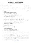 INFORMÁTICA Y PROGRAMACIÓN PRIMER PARCIAL GRUPOS GTM 25 de marzo de 2014, 9 horas. 1.‐ Tiempo: 90 m. Se considera la función f ( x) sen(2 x 5), x [ / 6, / 3] y el conjunto de puntos: S= / 6, / 4, / 3 . Obtén la mínima cota del error de interpolación en el intervalo [ / 6, / 3] empleando como soporte los puntos del conjunto S. (2 puntos) Solución: La expresión del error de interpolación de Lagrange es: f '''(c)