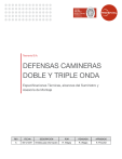 Tecnovial S.A. DEFENSAS CAMINERAS DOBLE Y TRIPLE ONDA Especificaciones Técnicas, alcances del Suministro y Asesoría de Montaje REV FECHA DESCRIPCIÓN POR REVISADO APROBADO A 09-12-2011 Emitido para información R. Villagra R. Villagra H. Pinochet Lote D Parcela 9 - Santa Ana de Chena - Maipú Santiago - Chile / Fono: (56-2) 537 2410 - Fax (56-2) 537 0535 www. tecnovial.cl 1.Introducción Las presentes Especificaciones Técnicas contienen los requerimientos básicos para el buen comportamiento de las barreras metálicas doble y triple onda suministrados por Tecnovial S.A. Las indicaciones aquí descritas son recomendaciones, y en ningún caso deberán sustituir o contradecir las indicaciones técnicas del diseño o de la ITO del proyecto. Los requerimientos aquí estipulados obedecen al cumplimiento del Manual de Carreteras y a los análisis desarrollados por nuestro Departamento de Ingeniería y Desarrollo. 1 Lote D Parcela 9 - Santa Ana de Chena - Maipú Santiago - Chile / Fono: (56-2) 537 2410 - Fax (56-2) 537 0535 www. tecnovial.cl 2.descripción del producto a) Acero El acero utilizado en la fabricación de todos los componentes metálicos de las barreras de contención es calidad A37-24ES (A240ES) para usos generales, conforme a lo establecido en NCh 203. b) Postes I. Doble Onda Los postes de sustentación son tipo costanera de 5 mm de espesor, 120 mm de ancho, 68 mm de ala y 18 mm en el pliegue del ala. La longitud fluctúa entre 1.500 y 2.000 mm; el largo que se use dependerá de la configuración de barrera que contemple el proyecto. Este tipo de poste posee tres perforaciones ovaladas de 55 x 18 mm en el alma, que permiten la unión apernada con el separador. En el ala derecha cuenta con una perforación ovalada de 55 x para la conexión del riel inferior y una circular de diámetro 18mm para los terminales que no llevan separador. Además, posee una perforación circular de diámetro 18 mm en el ala izquierda para la instalación del tensor longitudinal. II. Triple Onda Los postes de sustentación son tipo canal de 6 mm de espesor, 120 mm de ancho y 80 mm de ala. La longitud es de 2.000 mm. Este tipo de poste posee dos perforaciones ovaladas de 50 x 18 mm y otra de 55 x 18 mm, que permiten la unión apernada con el separador y el riel inferior respectivamente. En el ala derecha posee dos perforaciones ovaladas de 36 x 18 mm para postes utilizados en terminales que no llevan separador. Además, posee una perforación circular de diámetro 18 mm en el ala izquierda para la instalación del tensor longitudinal. 2 Lote D Parcela 9 - Santa Ana de Chena - Maipú Santiago - Chile / Fono: (56-2) 537 2410 - Fax (56-2) 537 0535 www. tecnovial.cl c) Barandas y separadores I. Doble Onda Las barandas son perfiles tipo W, según la norma AASHTO M 180. El largo total de cada perfil es de 4.320 mm, siendo su largo útil 4.000 mm. Los extremos del perfil llevan 8 perforaciones alargadas para su unión mediante pernos y un traslape adecuado. El espesor de acero en las barandas es de 3,0 ± 0,23 mm. El elemento separador posee una longitud de 334 mm y una altura de 194 mm, en su versión para barrera lateral. Para barrera simétrica, su longitud es de 767 mm, conservando la altura del anterior. II. Triple Onda Las barandas de triple onda son perfiles tipo “Thrie Beam” según la norma AASHTO M 180. El largo total de cada perfil es de 4.320 mm, siendo su largo útil 4.000 mm. Los extremos del perfil llevan 8 perforaciones alargadas para su unión mediante pernos y un traslape adecuado. El espesor de acero en las barandas es de 3,00 mm ± 0,23 mm. El elemento posee una longitud de 340 mm y una altura de 392 mm, en su versión para barrera lateral. Para barrera simétrica, su longitud es de 530 mm, conservando la altura del anterior. Otras piezas componentes de la barrera de triple onda, son el disipador de energía y el elemento de unión y desenganche. El disipador de energía va unido al separador y a la baranda, además posee perforaciones que permiten su desplazamiento en caso de impacto. El elemento de unión y desenganche une el poste, con el separador y con el tensor longitudinal. 3 Lote D Parcela 9 - Santa Ana de Chena - Maipú Santiago - Chile / Fono: (56-2) 537 2410 - Fax (56-2) 537 0535 www. tecnovial.cl d) Piezas accesorias y piezas terminales Si el Proyecto contempla el uso de configuraciones de barrera con riel inferior, este consistirá en un perfil tipo canal de 4 mm de espesor, 120 mm de alto, 65 mm de ancho y 4000 mm de largo, conectado mediante soportes a los postes de la barrera. Además, si el proyecto contempla el uso de configuraciones de barrera con tensor longitudinal, éste consistirá en una pieza de 5 mm de espesor, 65 mm de altura y de largo útil 4000 mm. Este tensor se une detrás de los postes mediante golillas, tuercas y pernos M16x32. e) Pernos y tuercas Para el montaje de las barreras se utilizan pernos y tuercas galvanizadas de 16mm de diámetro, suministrados en largos de 32mm y 45mm. Los pernos satisfacen las exigencias de la norma ASTM A-307, Grado A. Las tuercas son hexagonales, mientras la cabeza de los pernos son circulares para evitar los cantos vivos enfrentados al sentido del tráfico. f) Elementos reflectantes Con el propósito de mejorar la visibilidad nocturna de las barreras, se considera además la instalación de elementos reflectantes apernados, espaciados según las distancias indicadas en la Tabla N°1. Dichos elementos son fabricados en placa de acero galvanizado en caliente de 2 mm de espesor y llevan una cinta reflectante tipo alta intensidad, en ambas caras. Radio Curva Horizontal (m) Distancia (m) Radios menores a 100 4 100 ≤ Radio < 200 8 200 ≤ Radio < 300 16 300 ≤ Radio < 500 20 500 ≤ Radio y tramo recto 24 Tabla Nº1: Espaciamiento de los Elementos Reflectantes Estos elementos deben colocarse en el valle de la baranda. 4 Lote D Parcela 9 - Santa Ana de Chena - Maipú Santiago - Chile / Fono: (56-2) 537 2410 - Fax (56-2) 537 