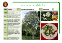 Especie: Sapirangy Nombre Científico: Origen de la planta Autóctono de América de Sur tropical y subtropical, desde Brasil, hasta el noreste de Argentina Forma Es un árbol siempre verde, de hasta 15 m. de altura. La copa es densa y redondeada y el tronco suele ser corto Corteza La corteza es lisa de color grisácea y al ser raspada tiene color amarillo claro. Si se la corta expide un látex blanco Flores Las flores son cimas axilares o terminales de color blanco, fragantes. Florece de noviembre a febrero. Frutos Los frutos son foliculos anaranjados y rugosos, con numerosas semillas Ecología Usos Ocupa los matorrales, chacras y capuerones recientes de la región oriental del Paraguay. Se establece rápidamente en los terrenos abiertos y puede convertirse en una plaga dificil de controlar La madera se utiliza solamente como leña. El latex se utiliza en medicina popular para afecciónes cutaneas. Tabernaemontana australis Muell Familia Botánica: Apocynaceae Nº 1 Especie: Mbokaja Nombre Acrocomia aculeata (Jacq.) Lodd. ex Mart. Científico: (Acrocomia totai Mart.) Origen de la planta Se encuentra desde el Sur de México hasta el Norte de Argentina, Forma El tronco es de tipo estípite espinozo de 12 hasta 20 metros de altura, que culmina en un penacho foliáceo Hojas Muestra hojas persistentes, pinnadas, con numerosos folíolos que nacen en planos diferentes, color verde claro, muy glabros, con el raquis duro y espinoso, de 1,5 a 3,5 m de largo. Flores y Frutos Las flores forman inflorescencias de color amarillo pálido o pardo, que aparecen a comienzos del verano. El fruto es una drupa globosa, tiene de 3-4 cm de diámetro. Es comestible y muy apetecido por los animales. Ecología Se desarrolla principalmente de norte a sur de la Región Oriental, en una franja de unos 150 kilómetros de ancho al Este del río Paraguay. Solamente crece en terrenos relativamente altos, con buen drenaje como las arenas rojas . Usos Los frutos pueden aprovecharse para la extracción de aceite, alimentación humana y animal; producción de abonos orgánicos y carbón vegetal. Familia Botánica: Arecaceae Nº 2 Especie: Pindó Nombre Científico: Origen de la planta Autóctono de América de Sur tropical y subtropical, desde Brasil, hasta el noreste de Argentina y Uruguay Forma Es una palma grande de hasta 25 metros de altura de tronco largo y grueso. Corteza La corteza es lisa de color grisácea algo anillada. No hay separación entre el tronco y el nacimiento de las hojas Flores Las flores son paniculas interfoliares, amarillas . Florece en los meses de verano Frutos Los frutos son drupas carnosas anaranjadas, dulces y comestibles. Frutifica en otoño. Ecología Esta presente en toda la región oriental , pero es mas frecuente en la Cuenca del Río Paraná. Es característica del bosque alto, y abundante en donde el suelo limita el crecimiento de otras especies.. A menudo cuando se realiza el desmonte, quedan de pie los pindós. La madera se utiliza como postes en construcciones rurals. Usos Los guajakies hacen sus arcos de esta madera. Syagrus romanzoffiana (Cham.) Glassman Familia Botánica: Arecaceae Nº 3 Especie: Jakarandá Ka’i jepopete Nombre Científico: Origen de la planta Nor-Oeste de Argentina hasta Bolivia y Nor-Este del Paraguay. Sembrado en todo el mundo como ornamental con el nombre de “palisandro” Forma Árbol de hojas caducas de hasta 20 metros de altura , copa redondeada y frondosa. Las ramas son largas y tortuosas. Corteza La corteza es semi aspera de color castaño claro y con grietas cortas. Se suele desprender en escamas cortas. Flores La inflorescencia es una panícula terminal muy grande con flores de color azul violaceo. Florece entre setiembre a diciembre. Frutos El fruto es una cápsula redondeada , aplanada y dura.. Cuando madura se abre en dos partes en forma de castañuelas. Ecología En nuestro país se encuentra en forma natural en la zona chaqueña, desde filadelfia hasta el Cerro León. Usos Es usado exclusivamente en forma ornamental en virtud a sus hermosas flores y follaje similar a los helechos. Jacaranda mimosifolia D. Don Familia Botánica: Bignoniaceae Nº 4 Especie: Lapacho amarillo Nombre Handroanthus Científico: Tababuia alba Origen de la planta Sur de Brasil, Nor-Este de Argentina y Este de Paraguay. Forma Es un árbol grande de hasta 28 metros de altura, copa poco densa y follaje bicolor. Corteza La corteza es grisácea, con fisuras longitudinales que forman placas irregulares. Flores La inflorecencia es una panicula terminal ancha de color amarillo intenso . Florece de Setiembre a Octubre.. Frutos El fruto es una capsula angosta y alargada con numerosas semillas aplanadas. Ecología Habita casi exclusivamente los sitios bajos con suelos húmedos pero profundos, donde forma parte del estrato superior. Usos La madera es dura y pesada, pero poco o utilizada debido a su escasez. Tiene mayor empleo como planta ornamental por sus hermosas flores. albus Familia Botánica: Bignoniaceae Nº 5 Especie: Lapacho Tajy hu Nombre Handroanthus heptaphyllus Científico: Tababuia heptaphylla Origen de la planta Se distribuye en gran parte de América desde Panamá hasta el Norte de Argentina Forma Es uno de los árboles mas altos del Paraguay, pudiendo superar los 35 m. y con diámetros de hasta 160 cm. Su tronco es cilíndrico y recto de hasta 18m. de fuste limpio sin ramas. Corteza La corteza es grisácea a negruzca, áspera con surcos longitudinales profundos y largos. Hojas Flores y Frutos Hojas compuestas digitadas con 5 a 7 foliolos aserrados de 3 a 10 cm de largo. La inflorescencia es una panícula terminal con numerosas flores vistosas de color rosado intenso. Algunos individuos pueden tener flores blancas (Lapacho blanco). Florece de agosto a octubre y fructifica hasta diciembre. Ecología Usos Prefiere suelos fértiles y profundos, tanto arenosos como arcillosos. Hoy en día ya es difícil encontrar arboles gigantes debido a la sobreexplotación que ha sufr
